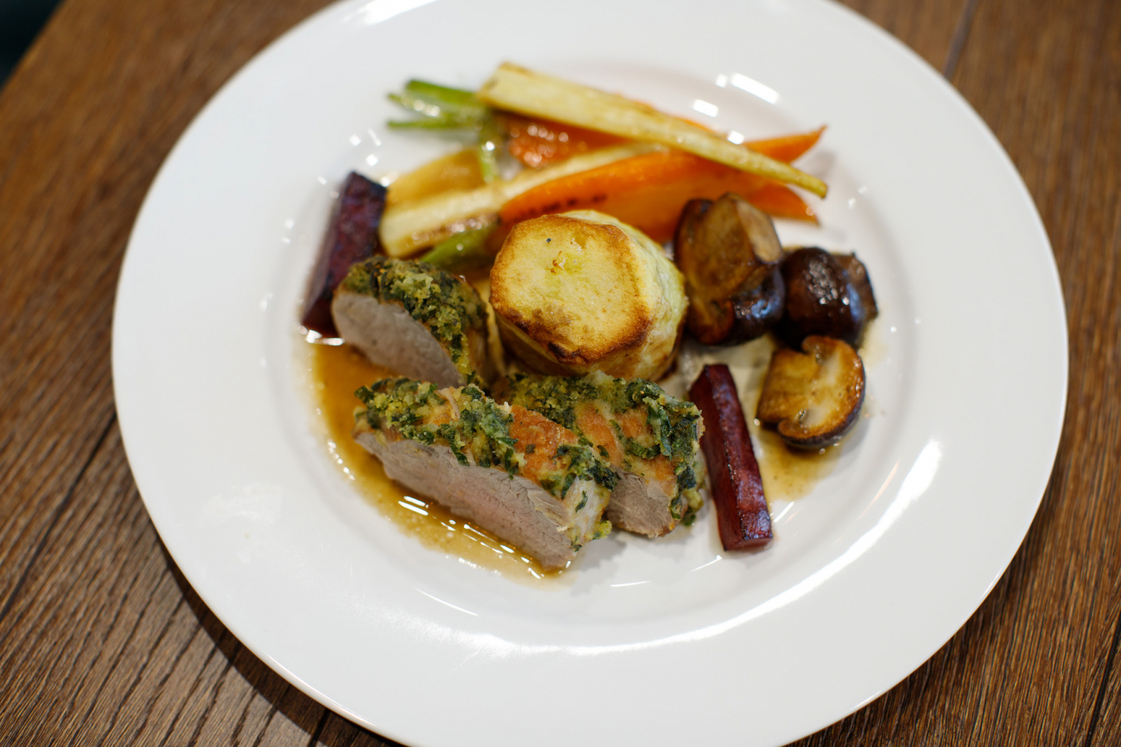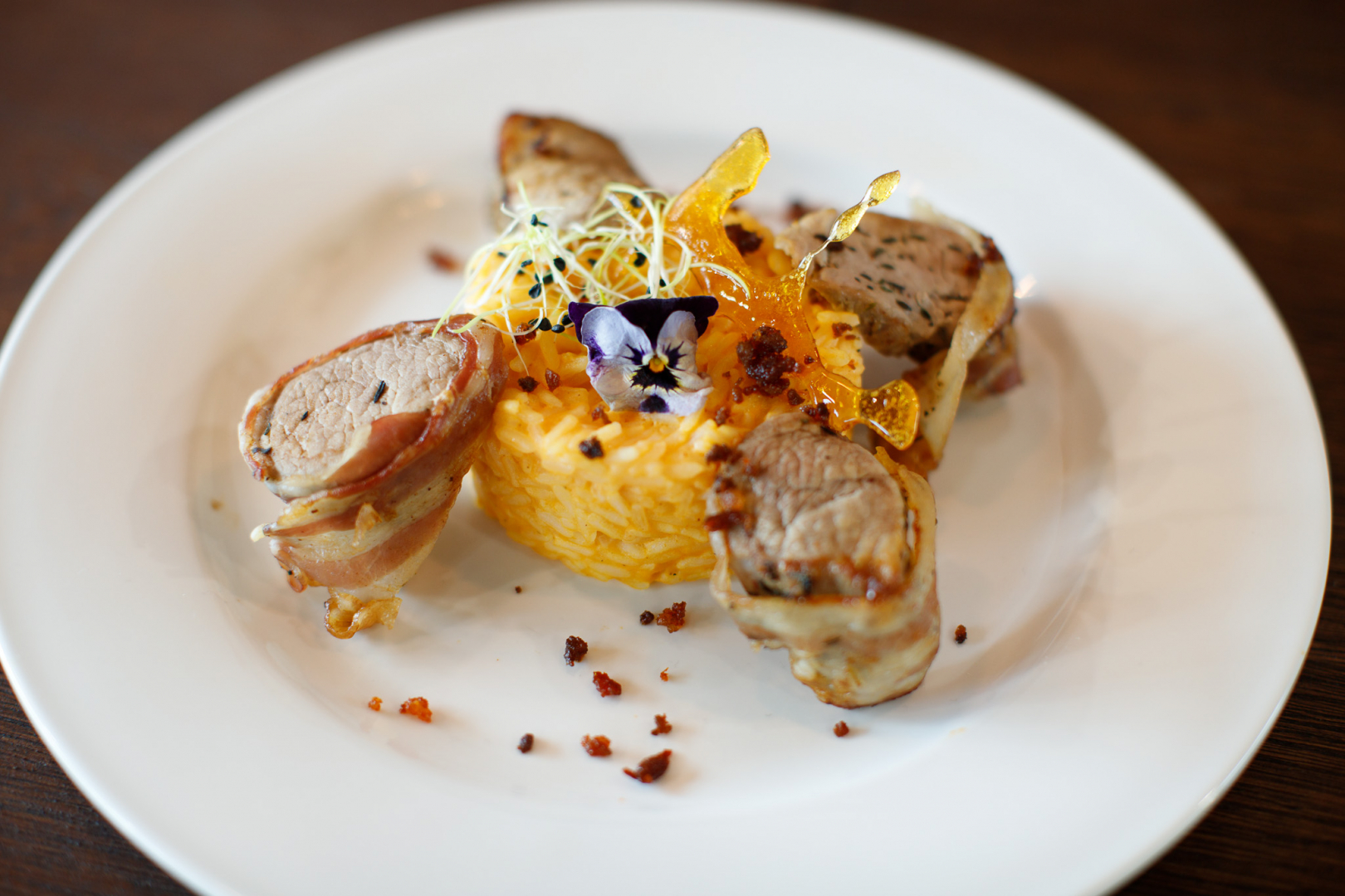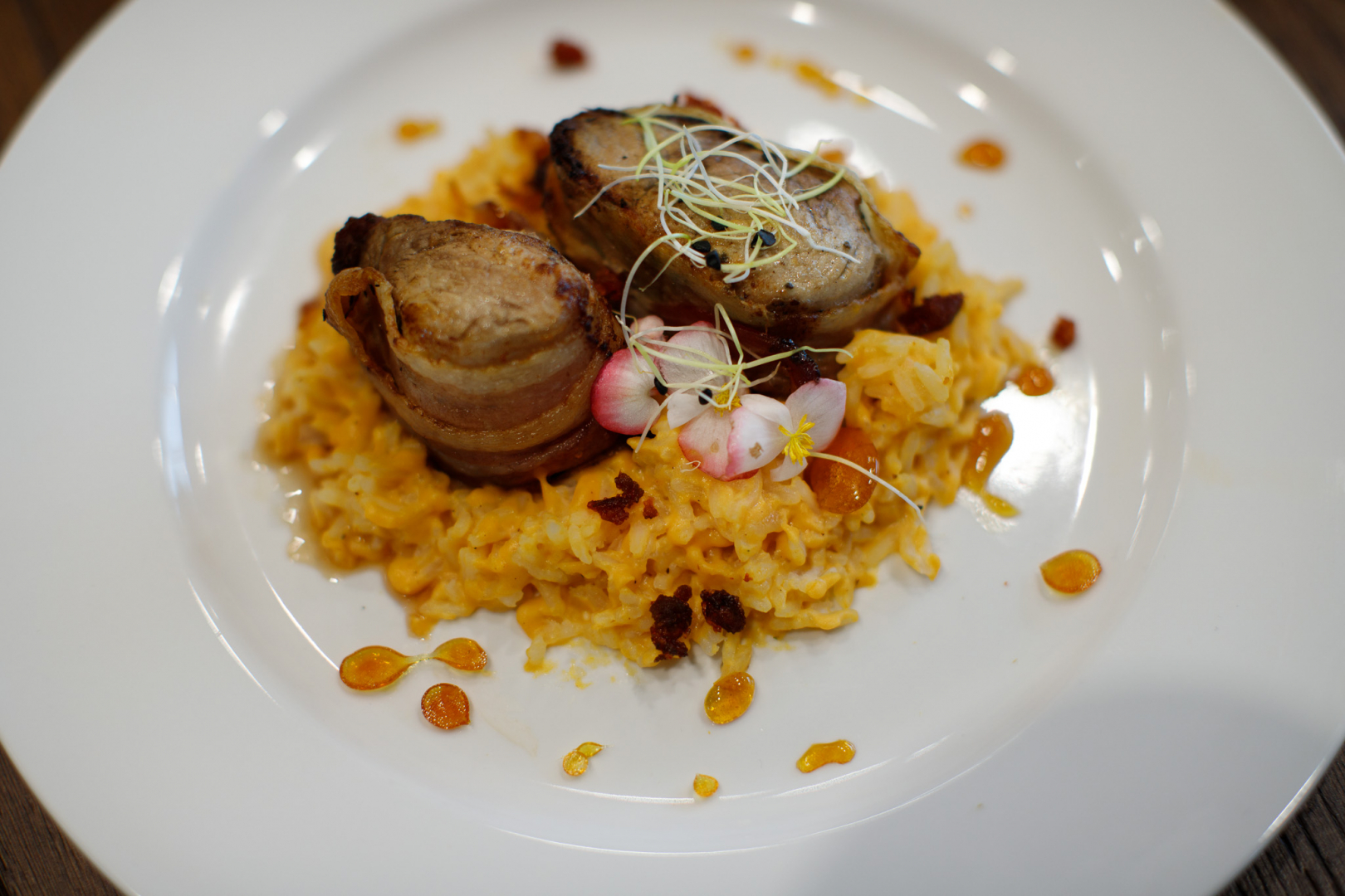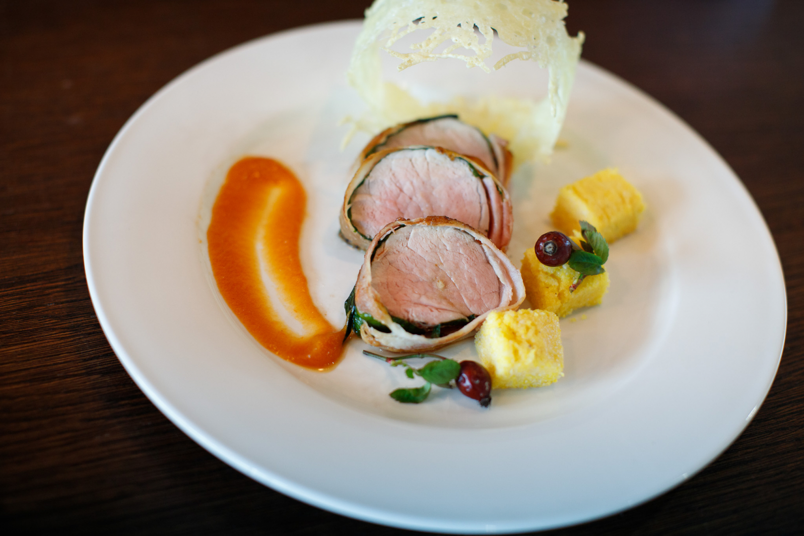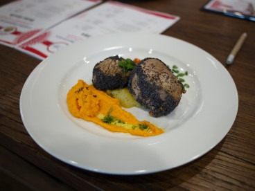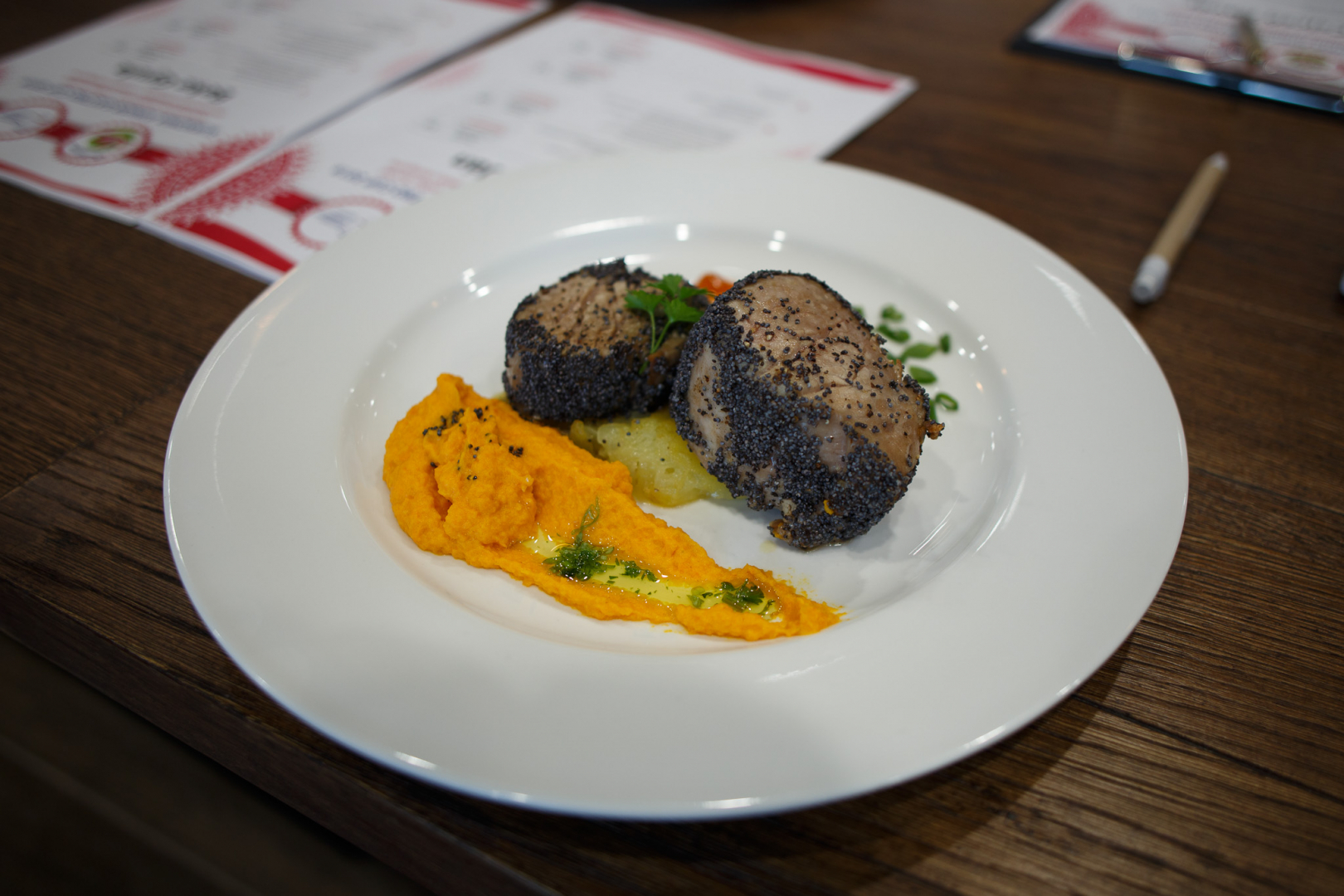 * Víťazné menu: Bravčová panenka s medvedím cesnakom a slaninkou, kukuričná polenta, espuma zo šípkovej omáčky